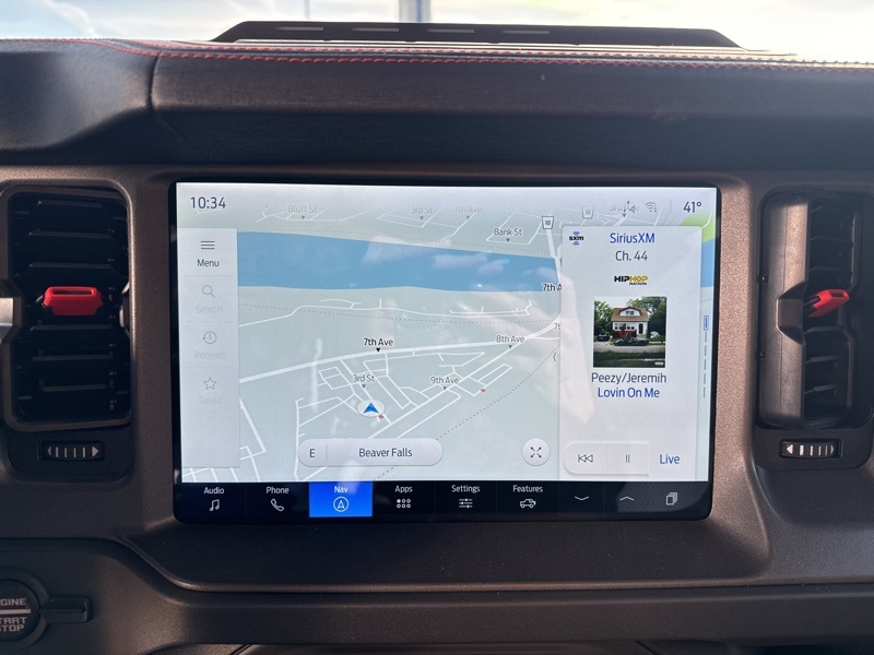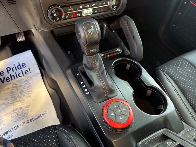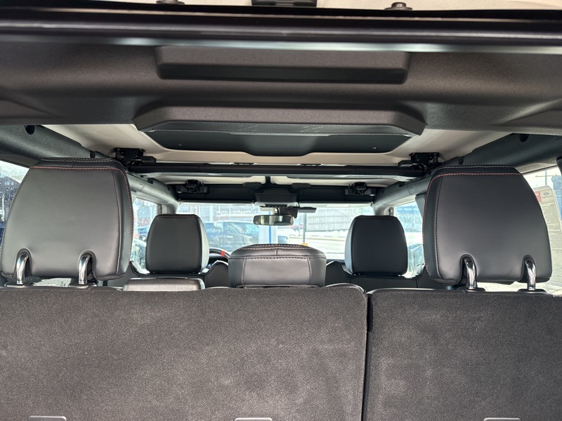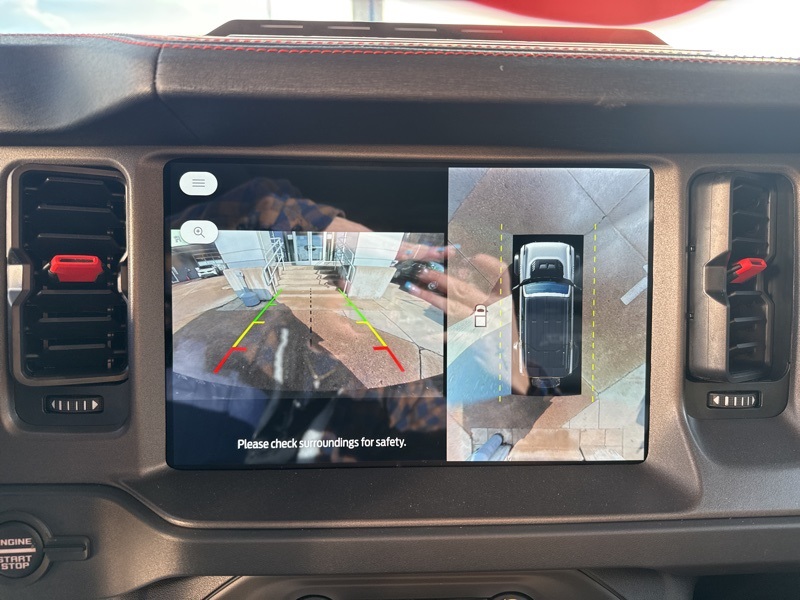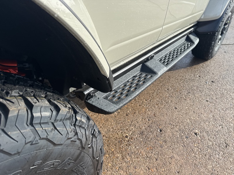 Inside, the Onyx leather-trimmed and suede seats deliver Raptor-level luxury with serious durability. A digital instrument cluster, massive 12-inch touchscreen, 360-degree camera, auxiliary switches, and carbon fiber interior accents keep things both functional and premium. The Lux Package, sound-deadening headliner, and B&O-quality audio experience make long drives just as enjoyable as off-road chaos. With factory tube doors included, this Bronco is ready for open-air adventure the moment it leaves the lot.