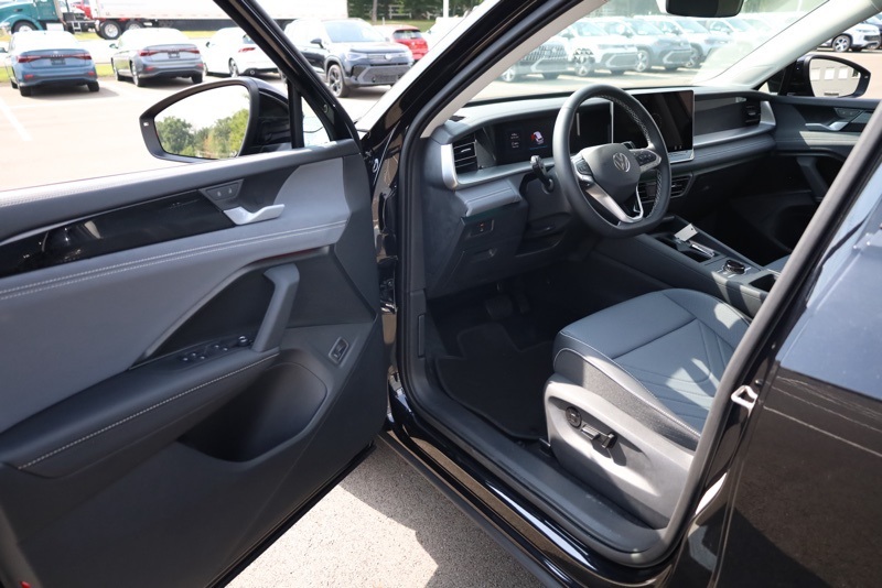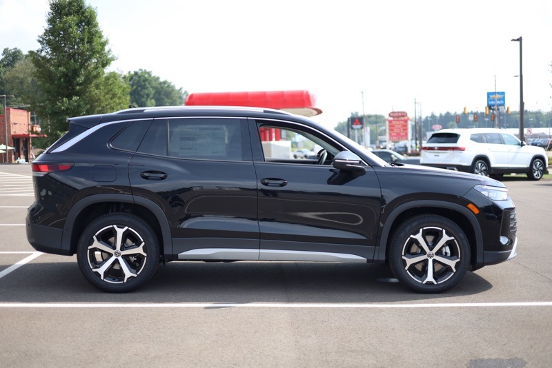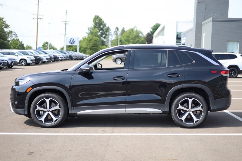 AWD, 4-Wheel Disc Brakes, 4-Wheel Independent Suspension, 7 Speakers, ABS brakes, Air Conditioning, Alloy wheels, AM/FM radio: SiriusXM with 360L, Auto High-beam Headlights, Auto-dimming Rear-View mirror, Automatic temperature control, Brake assist, Bumpers: body-color, Compass, Delay-off headlights, Driver door bin, Driver vanity mirror, Dual front impact airbags, Dual front side impact airbags, Electronic Stability Control, Emergency communication system: VW Car-Net Safe & Secure 5-year, Exterior Parking Camera Rear, Four wheel independent suspension, Front anti-roll bar, Front Bucket Seats, Front Center Armrest, Front dual zone A/C, Front reading lights, Fully automatic headlights, Heated door mirrors, Heated Front Seats, Heated front seats, Illuminated entry, Knee airbag, Leather Shift Knob, Low tire pressure warning, Occupant sensing airbag, Outside temperature display, Overhead airbag, Overhead console, Panic alarm, Panoramic Sunroof Package, Passenger door bin, Passenger vanity mirror, Perforated V-Tex Leatherette Seating Surfaces, Power door mirrors, Power driver seat, Power Liftgate, Power steering, Power windows, Radio data system, Radio: MIB4 Composition Media Touchscreen AM/FM, Rain sensing wipers, Rear anti-roll bar, Rear reading lights, Rear seat center armrest, Rear side impact airbag, Rear window defroster, Rear window wiper, Remote keyless entry, Security system, Speed control, Speed-sensing steering, Split folding rear seat, Spoiler, Steering wheel mounted audio controls, Tachometer, Telescoping steering wheel, Tilt steering wheel, Traction control, Trip computer, Turn signal indicator mirrors, Variably intermittent wipers, VW Care, Wheels: 19" 2-Tone Machined Alloy. Deep Black Pearl 2025 Volkswagen Tiguan 2.0T SE AWD 8-Speed Automatic 2.0L TSI DOHC