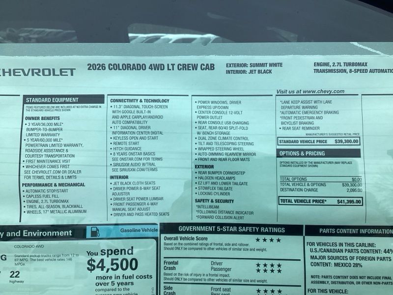 Summit White 2026 Colorado Chevrolet LT 4D Crew Cab 4WD 8-Speed Automatic 2.7L I4 Turbocharged DOHC 16V LEV3-ULEV50 310hp Price includes: $1000 - Chevrolet Consumer Cash Program. Exp. 03/31/2026
