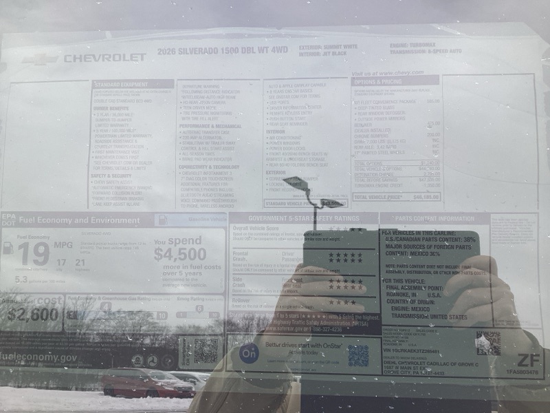 Summit White 2026 Silverado 1500 Chevrolet WT 4D Extended Cab 4WD 8-Speed Automatic 2.7L I4 Turbocharged DOHC 16V LEV3-SULEV30 310hp Price includes: $1000 - GM Bonus Cash. Exp. 02/02/2026 $3000 - Chevrolet Consumer Cash Program. Exp. 02/02/2026