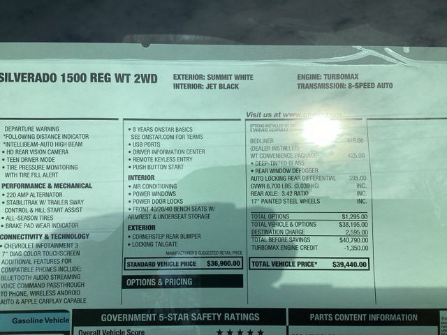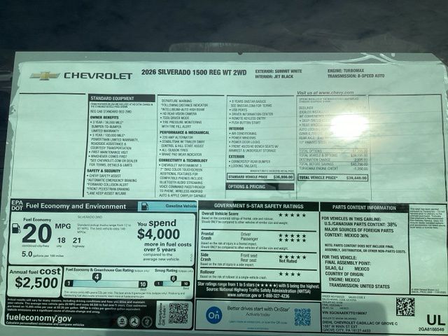 Summit White 2026 Silverado 1500 Chevrolet WT 2D Standard Cab RWD 8-Speed Automatic 2.7L I4 Turbocharged DOHC 16V LEV3-SULEV30 310hp Price includes: $3000 - Chevrolet Consumer Cash Program. Exp. 03/31/2026