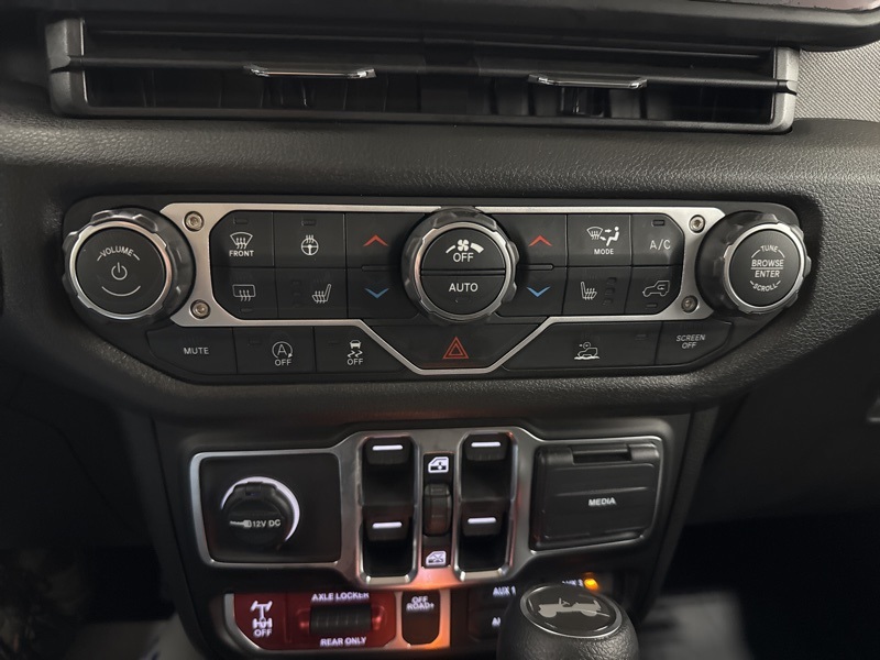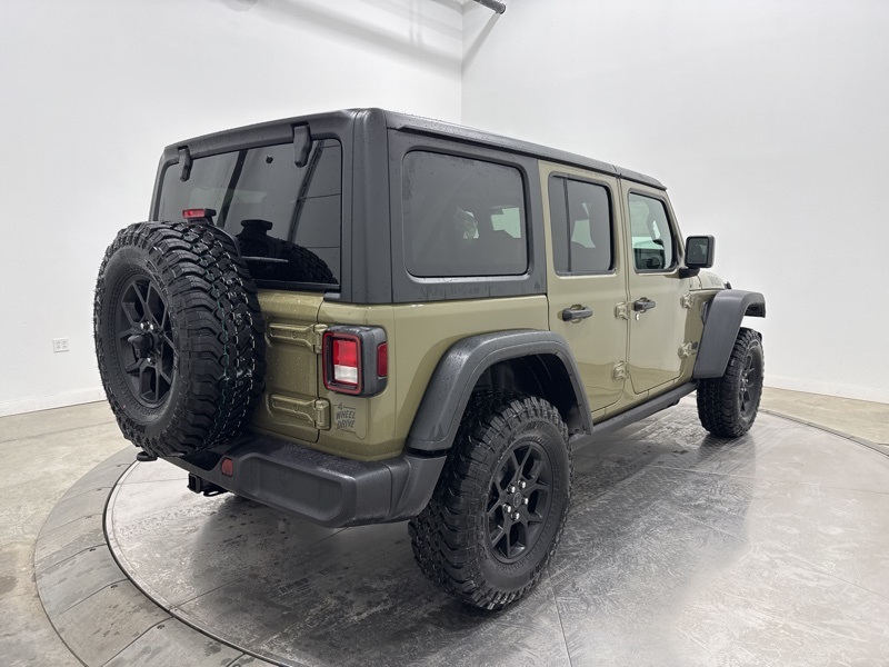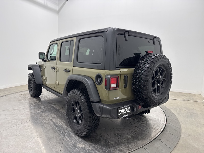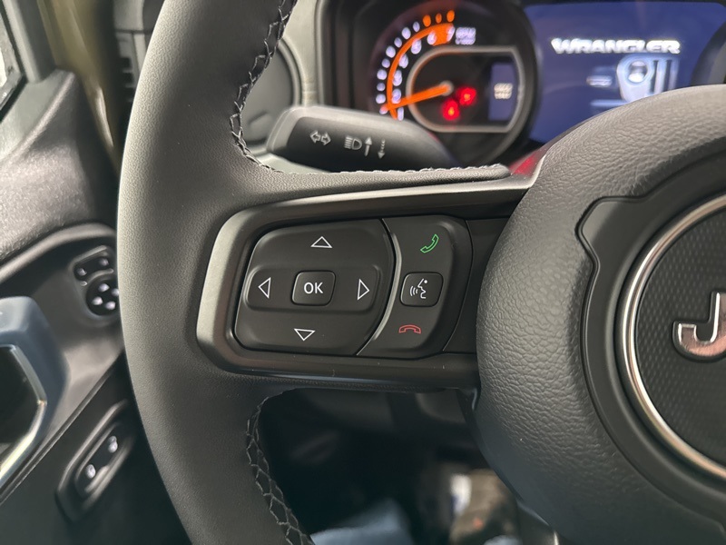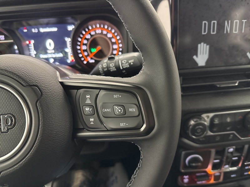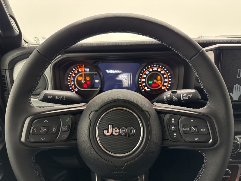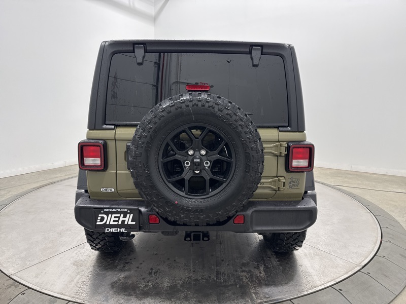 2-Door Passive Entry, Front Door Locks, 4-Wheel Drive Swing Gate Decal, 4.10 Rear Axle Ratio, 7 and 4 Pin Wiring Harness, Advanced Brake Assist, Air Conditioning with Auto Temp Control, Air Filtering, Automatic Headlamps, Auxiliary Switches, Black Grille with Gloss Black Rings, Class II Receiver Hitch, Cluster 7.0" TFT Color Display, Convenience Group, Conventional Differential Front Axle, Corning Gorilla Glass, Dana M210 Wide HD Tube Front Axle, Dana M220 Wide Rear Axle, Daytime Running Lamps LED Accents, Deep Tint Sunscreen Windows, Dual Top Group, E-Locker Rear Axle, Emergency/Assistance Call, Enhanced Adaptive Cruise Control, Front LED Fog Lamps, Full Speed Forward Collision Warning Plus, Heated Front Seats, Heated Steering Wheel, Injection Molded Black Rear Bumper, LED Premium Reflector Headlamps, Mold in Color Bumper with Gloss Black, Molded in Color Rubicon Highline Flare, MOPAR All-Weather Floor Mats, Off-Road Plus Mode, Power Dome Dual Vented Hood, Power Heated Mirrors, Premium Black Sunrider Soft Top with Dual Top Group, Premium Wrapped Steering Wheel, Quick Order Package 24W Willys, Security Alarm, Steel Power Dome Hood Package, Sun Visors with Illuminated Vanity Mirrors, Universal Garage Door Opener, Wheels: 17" x 7.5" Painted Black, Willy's Suspension, Willys Hood Decal.