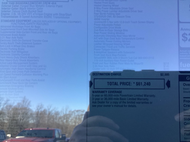 Forged Blue Metallic 2026 1500 Ram Big Horn/Lone Star 4D Crew Cab 4WD 8-Speed Automatic 3.6L V6 24V VVT Price includes: $2000 - 2026 National SFS Lease Loyalty Bonus Cash . Exp. 02/02/2026 $3500 - 2026 National Retail Consumer Cash . Exp. 02/02/2026