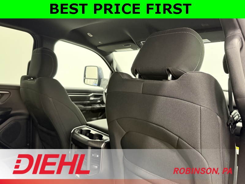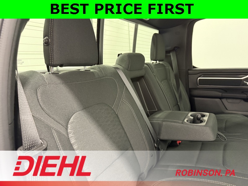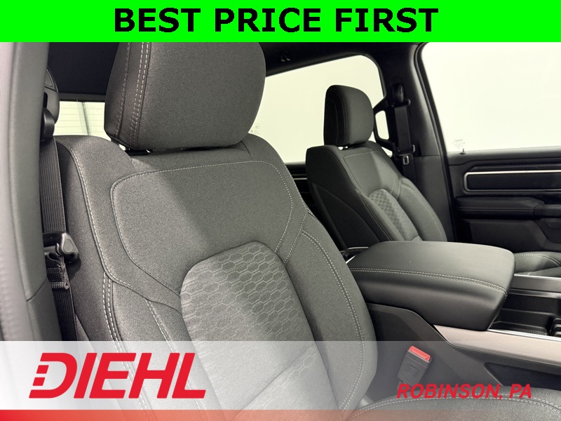 Inside, this Big Horn is way more refined than the name suggests. You get a large touchscreen with navigation, Apple CarPlay, and Android Auto, plus a digital gauge cluster that makes the cabin feel modern instead of “work truck basic.” The Crew Cab gives you real back-seat space — not “technically seats,” but actual adult-sized comfort — and there’s plenty of smart storage so your stuff doesn’t end up rolling around like it’s in a washing machine. It’s comfortable enough for long drives and tough enough that you don’t feel bad tossing gear in the back.