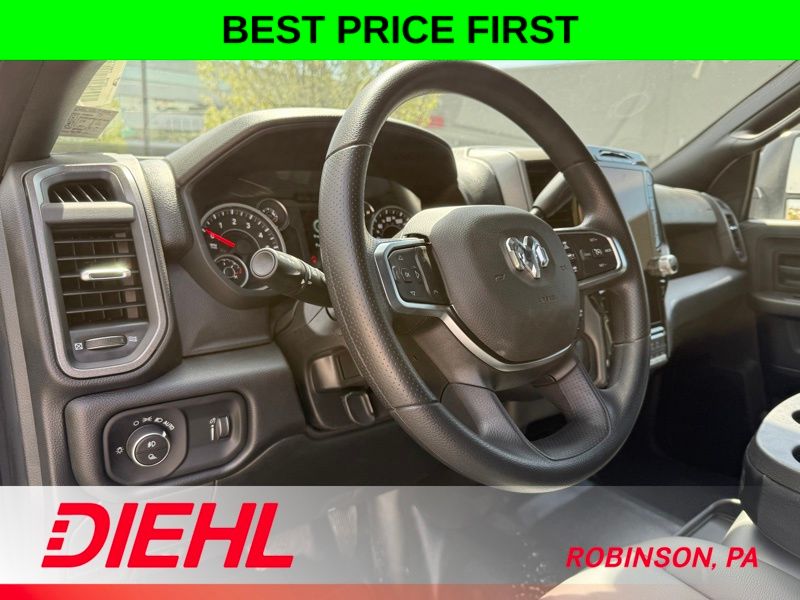 Safety and convenience are also top priorities. The 2026 Ram 3500 Tradesman comes equipped with a ParkSense Front/Rear Park Assist System, Tinted Acoustic Windshield Glass, and an Emergency Vehicle Alert System. Exterior features like the Mopar Black Tubular Side Steps and power-adjustable, heated, and folding mirrors add both style and functionality.