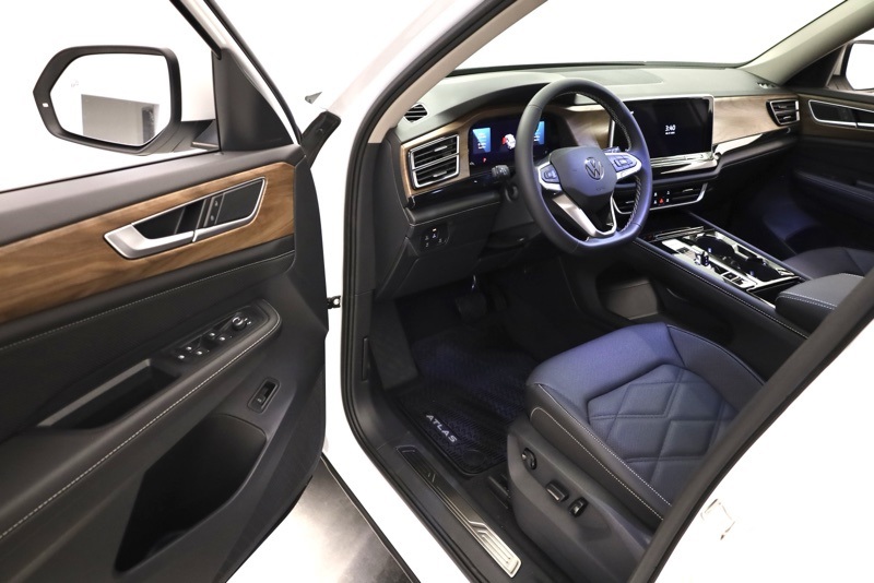 3rd row seats: split-bench, 4-Wheel Disc Brakes, 6 Speakers, ABS brakes, Active Cruise Control, Air Conditioning, Alloy wheels, AM/FM radio: SiriusXM with 360L, Auto High-beam Headlights, Auto-dimming Rear-View mirror, Automatic temperature control, Black Wheel Package, Brake assist, Bumpers: body-color, Compass, Delay-off headlights, Driver door bin, Driver vanity mirror, Dual front impact airbags, Dual front side impact airbags, Electronic Stability Control, Exterior Parking Camera Rear, Four wheel independent suspension, Front anti-roll bar, Front Bucket Seats, Front Center Armrest, Front dual zone A/C, Front fog lights, Front reading lights, Fully automatic headlights, Heated & Actively Ventilated Front Bucket Seats, Heated door mirrors, Heated front seats, Heated steering wheel, Illuminated entry, Low tire pressure warning, Occupant sensing airbag, Outside temperature display, Overhead airbag, Overhead console, Panic alarm, Passenger door bin, Passenger vanity mirror, Perforated V-Tex Leatherette Seating Surfaces, Power door mirrors, Power driver seat, Power Liftgate, Power steering, Power windows, Radio data system, Radio: MIB3 Composition Media, Rain sensing wipers, Rear air conditioning, Rear anti-roll bar, Rear reading lights, Rear seat center armrest, Rear window defroster, Rear window wiper, Remote keyless entry, Security system, Speed control, Speed-sensing steering, Split folding rear seat, Spoiler, Steering wheel mounted audio controls, Tachometer, Telescoping steering wheel, Tilt steering wheel, Traction control, Trip computer, Turn signal indicator mirrors, Variably intermittent wipers, Ventilated front seats, VW Care, Wheels: 20" Multi-Spoke Black Painted Alloy. pal White Pearl 2026 Volkswagen Atlas 2.0T SE w/Technology AWD 8-Speed Automatic with Tiptronic 2.0L TSI