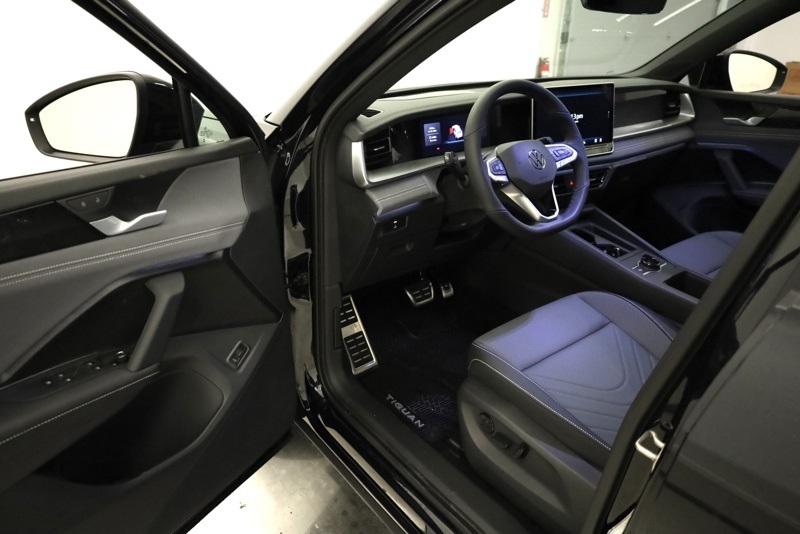 AWD, 4-Wheel Disc Brakes, 4-Wheel Independent Suspension, 7 Speakers, ABS brakes, Air Conditioning, Alloy wheels, AM/FM radio: SiriusXM with 360L, Auto High-beam Headlights, Auto-dimming Rear-View mirror, Automatic temperature control, Brake assist, Bumpers: body-color, Compass, Delay-off headlights, Driver door bin, Driver vanity mirror, Dual front impact airbags, Dual front side impact airbags, Electronic Stability Control, Emergency communication system, Exterior Parking Camera Rear, Four wheel independent suspension, Front anti-roll bar, Front Bucket Seats, Front Center Armrest, Front dual zone A/C, Front reading lights, Fully automatic headlights, Heads-Up Display, Heated door mirrors, Heated Front Seats, Heated front seats, Illuminated entry, Knee airbag, Leather Shift Knob, Leather steering wheel, Low tire pressure warning, Occupant sensing airbag, Outside temperature display, Overhead airbag, Overhead console, Panic alarm, Passenger door bin, Passenger vanity mirror, Perforated V-Tex Leatherette Seating Surfaces, Power door mirrors, Power driver seat, Power Liftgate, Power moonroof: Panoramic, Power steering, Power windows, Radio data system, Radio: MIB4 Composition Media Touchscreen with AM/FM, Rain sensing wipers, Rear anti-roll bar, Rear reading lights, Rear seat center armrest, Rear side impact airbag, Rear window defroster, Rear window wiper, Remote keyless entry, Security system, Speed control, Speed-sensing steering, Split folding rear seat, Spoiler, Sport steering wheel, Steering wheel mounted audio controls, Tachometer, Telescoping steering wheel, Tilt steering wheel, Traction control, Trip computer, Turn signal indicator mirrors, Variably intermittent wipers, Wheels: 20" Black Painted Alloy. deep black pearl 2026 Volkswagen Tiguan 2.0T SE R-Line Black AWD 8-Speed Automatic 2.0L TSI DOHC