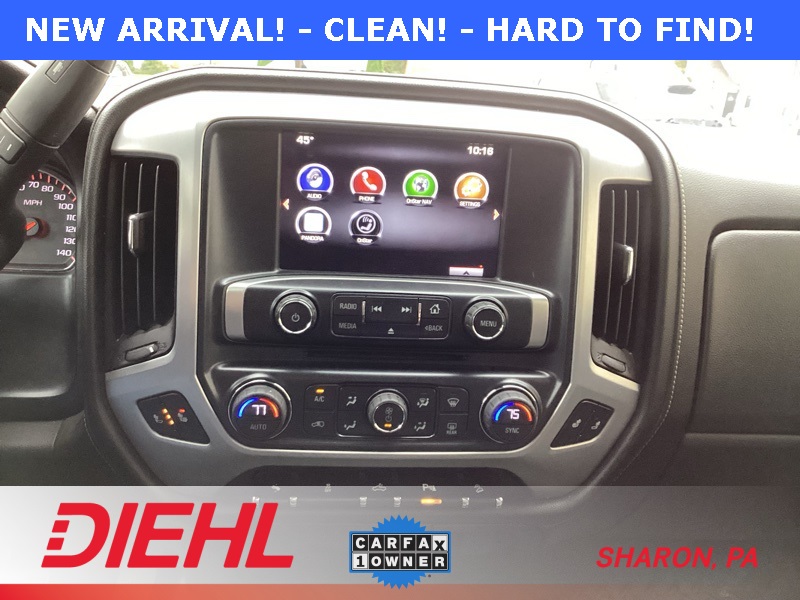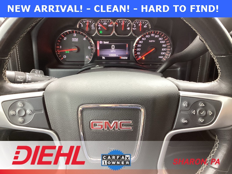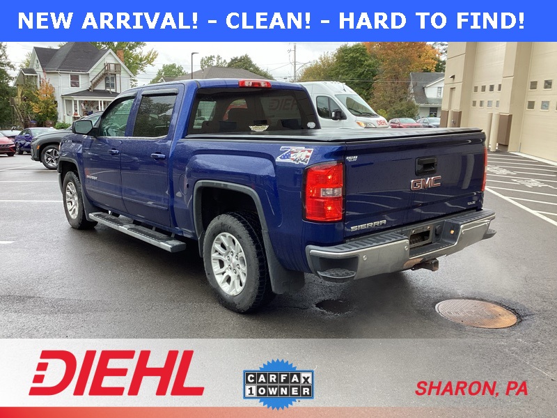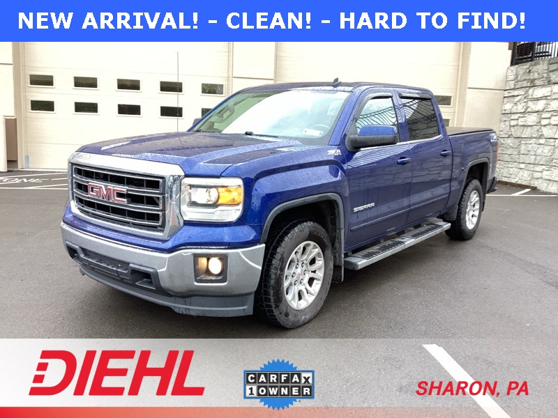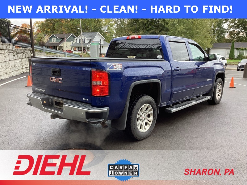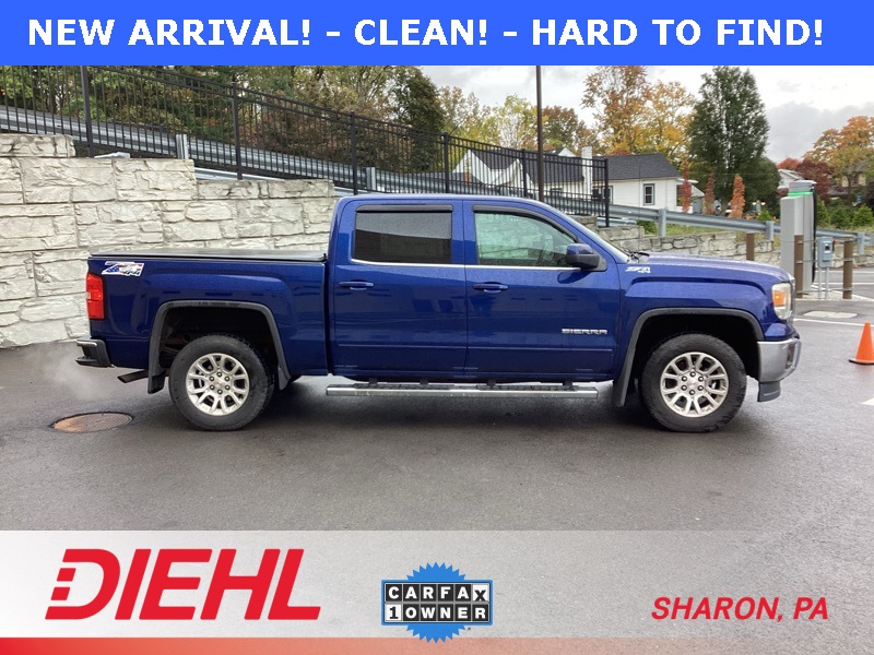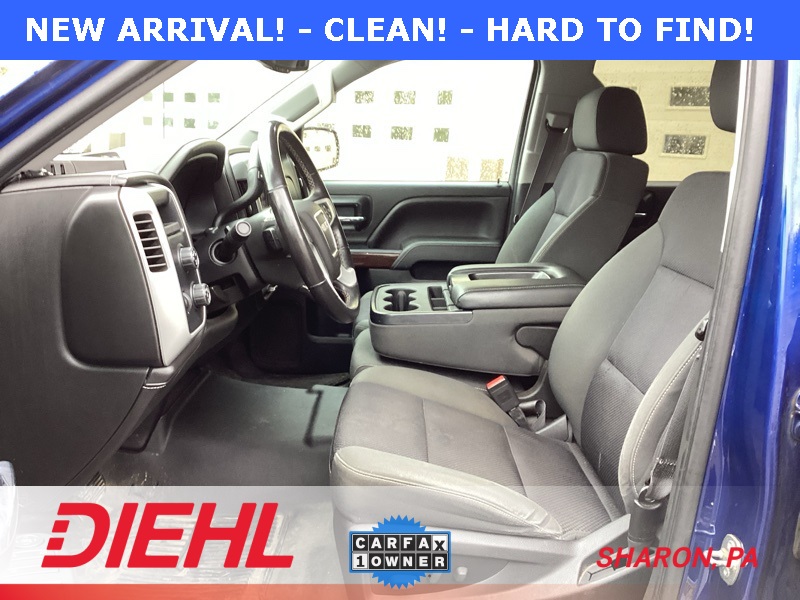 **ONE-OWNER**, 6-Speed Automatic Electronic with Overdrive, 4WD, Black Cloth, 10-Way Power Driver's Seat Adjuster, 110-Volt AC Power Outlet, 150 Amp Alternator, 3.42 Rear Axle Ratio, 4-Wheel Disc Brakes, 4.2" Diagonal Color Display Driver Info Center, 40/20/40 Front Split Bench Seat, 6 Speakers, ABS brakes, Air Conditioning, Alloy wheels, AM/FM radio: SiriusXM, Auxiliary External Transmission Oil Cooler, Body Color Bodyside Moldings, Body Color Door Handles, Body Color Power-Adjustable Heated Outside Mirrors, Bodyside moldings, Brake assist, Bumpers: chrome, CD player, Chrome Front Bumper, Chrome Grille Surround, Chrome Rear Bumper, Cloth Seat Trim, Color-Keyed Carpeting w/Rubberized Vinyl Floor Mats, Compass, Deep-Tinted Glass, Delay-off headlights, Driver & Front Passenger Illuminated Vanity Mirrors, Driver door bin, Driver vanity mirror, Dual front impact airbags, Dual front side impact airbags, Dual-Zone Automatic Climate Control, Electric Rear-Window Defogger, Electronic Autotrac Transfer Case, Electronic Stability Control, Emergency communication system: OnStar Directions & Connections, Exterior Parking Camera Rear, EZ Lift & Lower Tailgate, Front & Rear Molded Black Splash Guards (LPO), Front anti-roll bar, Front Center Armrest w/Storage, Front Frame-Mounted Black Recovery Hooks, Front Halogen Fog Lamps, Front reading lights, Front wheel independent suspension, Fully automatic headlights, Heated door mirrors, Heated Driver & Front Passenger Seats, Heavy Duty Suspension, Heavy-Duty Rear Locking Differential, Hill Descent Control, Illuminated entry, Leather Wrapped Steering Wheel w/Cruise Controls, LED Cargo Box Lighting, Low tire pressure warning, Manual Tilt Wheel Steering Column, Occupant sensing airbag, Off-Road Suspension Package, OnStar 6 Months Directions & Connections Plan, Outside temperature display, Overhead airbag, Overhead console, Panic alarm, Passenger door bin, Passenger vanity mirror, Power Adjustable Pedals, Power door mirrors, Power steering, Power windows, Power Windows w/Driver Express Up, Preferred Equipment Group 3SA, Premium audio system: IntelliLink, Radio data system, Radio: AM/FM Stereo w/8" Diagonal Color Touch Screen, Rear 60/40 Folding Bench Seat (Folds Up), Rear Bumper Cornersteps, Rear reading lights, Rear seat center armrest, Rear step bumper, Rear Vision Camera w/Dynamic Guide Lines, Rear Wheelhouse Liners, Remote Keyless Entry, Remote keyless entry, Remote Vehicle Starter System, Single Slot CD/MP3 Player, Single-Zone Air Conditioning, SiriusXM Satellite & HD Radio, SLE Convenience Package, SLE Value Package, Speed control, Speed-sensing steering, Split folding rear seat, Steering Wheel Audio Controls, Steering wheel mounted audio controls, Tachometer, Theft Deterrent System (Unauthorized Entry), Tilt steering wheel, Traction control, Trailering Equipment, Trip computer, Ultrasonic Rear Park Assist, Universal Home Remote, Variably intermittent wipers, Voltmeter, Wheels: 17" x 8" Bright Machined Aluminum, Wheels: 18" x 8.5" Bright Machined Aluminum. Cobalt Blue Metallic 2014 GMC Sierra 1500 SLE 4WD 6-Speed Automatic Electronic with Overdrive EcoTec3 5.3L V8 Flex Fuel