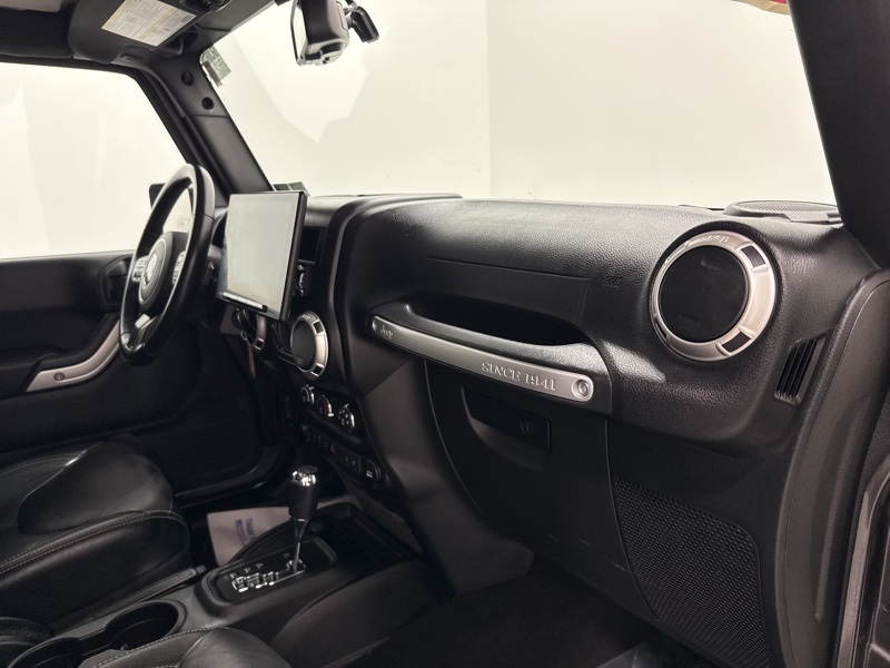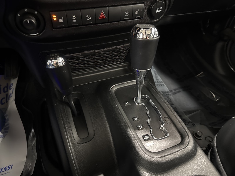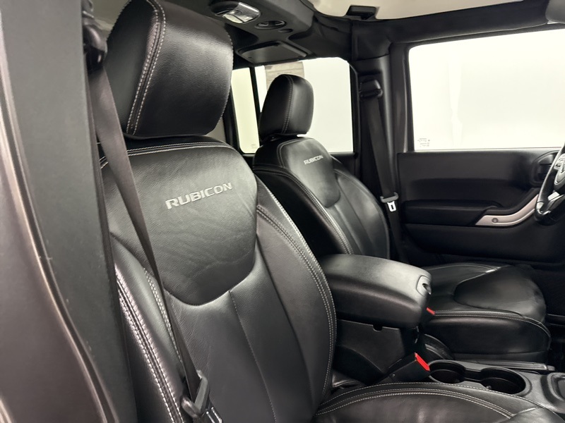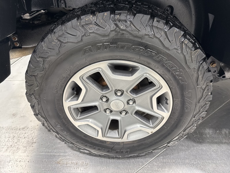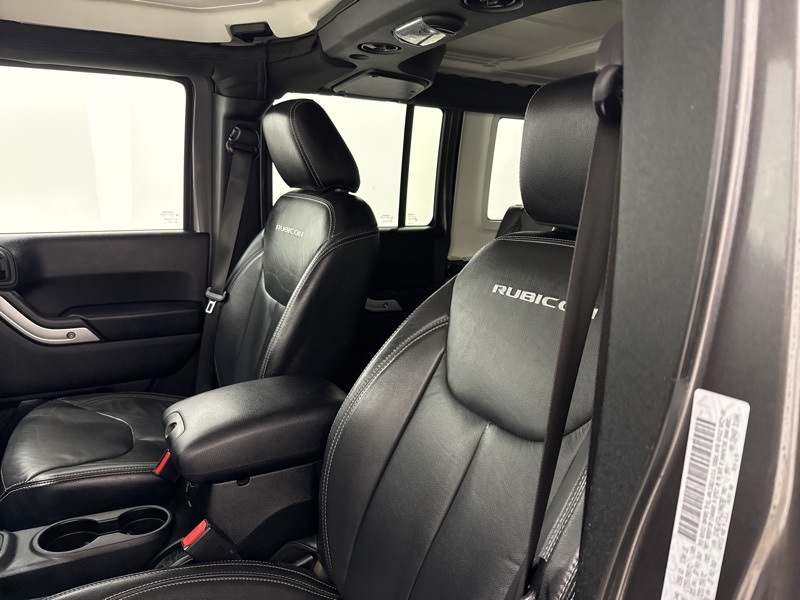 As a Rubicon, this Jeep comes equipped with serious hardware straight from the factory, including Tru-Lok electronic locking front and rear Dana 44 axles, electronic front sway bar disconnect, 4.10 axle ratio, heavy-duty axles, rock rails, skid plates, and BFGoodrich all-terrain tires mounted on 17-inch polished mineral gray wheels. This is a Wrangler designed to crawl, climb, and conquer without needing aftermarket upgrades.