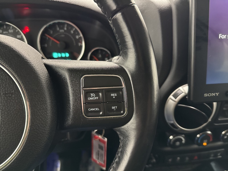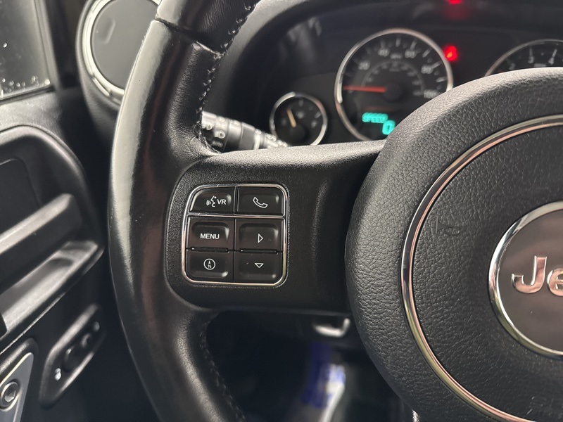 The interior balances rugged utility with comfort, featuring leather-trimmed bucket seats, heated front seats, leather-wrapped steering wheel, automatic climate control, power windows and locks, and steering wheel-mounted audio controls. Technology highlights include Uconnect with voice command and Bluetooth, GPS navigation, SiriusXM, an electronic vehicle information center, and a hard drive with available storage, giving you trail-ready capability without sacrificing convenience.