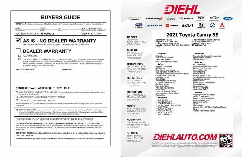 **ONE OWNER**, **CLEAN CARFAX**, **LANE KEEP ASSIST**, **FRONT CRASH DETECTION**, **BLUETOOTH**, **BACKUP CAMERA**, **PREMIUM WHEELS**, **ANDROID AUTO**, **APPLE CARPLAY*, Camry SE, Midnight Black Metallic, Black w/Fabric Seat Trim w/Sport SofTex, ABS brakes, Active Cruise Control, Alloy wheels, Auto High-beam Headlights, Delay-off headlights, Electronic Stability Control, Emergency communication system: Safety Connect with 1-year trial, Exterior Parking Camera Rear, Fully automatic headlights, Illuminated entry, Low tire pressure warning, Remote keyless entry, Traction control.